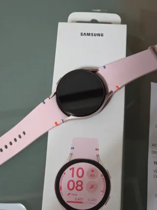 Reloj inteligente Samsung Galaxy Watch FE en color rosa. Incluye : - Correa adicional compatible negra para el reloj. - Correa original rosa. - Caja original completa, manuales, y cargador inalámbrico original. - Cristal templado recién cambiado. - Se adjuntan tickets de la renovación del cristal templado y de la correa negra adicional. - Contesta WhatsApp, llamadas, tiene IA Gemini con la reciente actualización, resistente al agua, cristal de zafiro, reloj muy completo. Entrega en mano en mi zona o realizo envíos, precio bastante ajustado, el reloj y los accesorios están completamente perfectos, poco uso, y como nuevos.