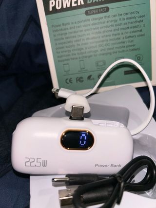 🔋 Mini Power Bank Portátil 20W – Carga Rápida para iPhone, Samsung y más 🔋 Power bank nuevo, con su caja y cable. Compacto, ligero y súper práctico — ¡ideal para llevar siempre contigo! 🔌 Compatible con: 📱 iPhone (con adaptador Lightning incluido) 📱 Dispositivos con USB-C (Samsung, Xiaomi, etc.) 🎧 AirPods y otros auriculares o accesorios Características: ⚡ Carga rápida de 20W 🔋 Indicador digital de batería 👜 Tamaño mini, perfecto para el día a día o viajes 🚨 Ideal para emergencias o cuando te quedas sin batería fuera de casa Un imprescindible para tener energía siempre a mano 💪 batería recargable, cargador emergencia