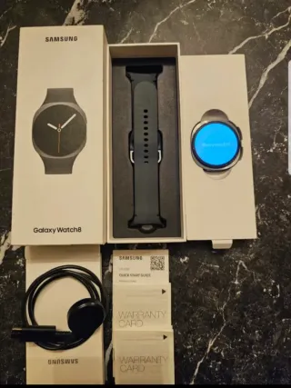 Reloj inteligente Samsung Galaxy Watch 8 en color negro, con muy poco uso. - Incluye cargador. - Incluye guía rápida y tarjetas de garantía. - incluye carcasa elegante de protección metálica colo plata Se aceptan cambios a móviles, tabletas o ordenadores.