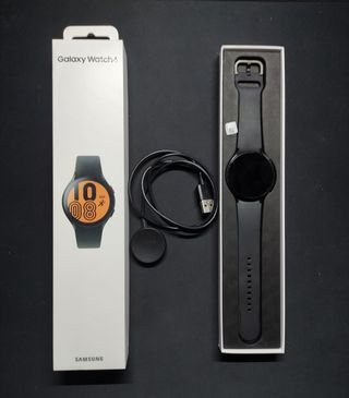 Reloj inteligente Samsung Galaxy Watch 4 en color negro. Incluye su cargador. - Diseño moderno y elegante. - Correa ajustable. - Base de carga circular.