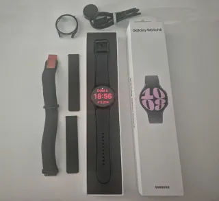 Reloj inteligente Samsung Galaxy Watch6 en color negro con detalles en rosa. - Incluye cargador inalámbrico. - Incluye 2 correas adicionales. - Protector de pa talla Se vende por cambio a otro modelo, lo único que tiene es un pequeño desgaste en la hebilla