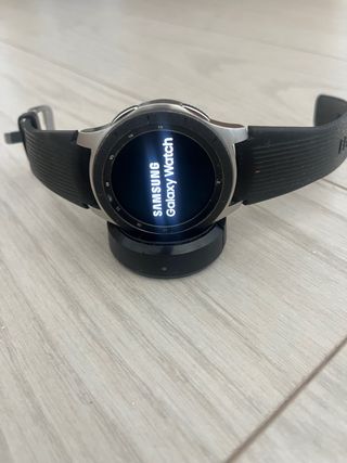 Reloj Samsung Galaxy Watch en plata y negro. Está en muy buen estado y lista para usar. - Incluye cargador original. - Correa de silicona negra.