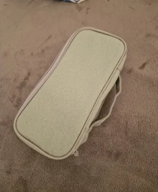 Práctico estuche organizador para guardar cargadores y cables. - Color gris claro. - Cierre de cremallera. - Compartimentos interiores para una mejor organización.