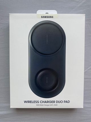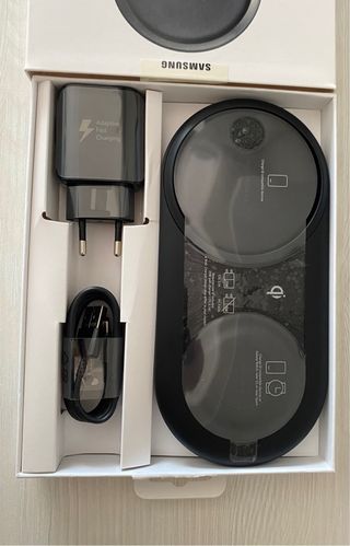 Vendo cargador doble Samsung Duo Pad. Está totalmente nuevo, solo abrí la caja para hacer las fotos. Me lo gané en un stand de Samsung y no lo voy a usar. 🔌 Incluye todo original: • Base de carga inalámbrica Duo Pad. • Cargador Samsung de carga rápida (AFC 25W). •Guía rápida de inicio. ⚡ Características: - Carga dos dispositivos al mismo tiempo - Compatible con carga rápida. - Diseño elegante y compacto. Ideal para cargar móvil + reloj o auriculares. Compatible con dispositivos Qi, tanto Samsung como de otras marcas, incluyendo móviles, auriculares y relojes con carga inalámbrica.