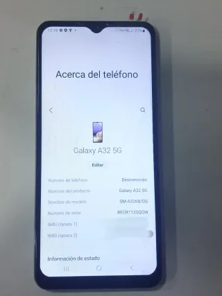 Teléfono móvil Samsung A32 5G con 128GB+4G de almacenamiento. - Color negro. - Conectividad 5G. -Pantalla nueva a estrenar, tenia una rajita y se cambió. -Poco uso, tiene todavía los plásticos de todo el canto y plástico de la pantalla. En buen estado, funcionando todo. Para usar directamente, sin contraseñas. Se entrega sin cargador (usa tipo C). Precio NO NEGOCIABLE. No se acepta devoluciones ya que puede ser manipulado. Ya me pasó con un teléfono y lo abrieron y cogieron piezas.