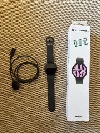 Reloj inteligente Samsung Galaxy Watch 6 en color negro. Incluye cargador. - Diseño elegante y moderno. - Correa ajustable. Está en perfecto estado aunque los filos están algo desgastados como se puede ver en las imágenes.