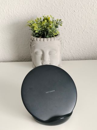 Cargador inalámbrico Samsung original, en perfecto estado. - Carga inalámbrica para móviles que dispongan de esta función. - Diseño elegante y compacto. - Color negro. No dispongo del cable que conecta a la corriente, pero vale cualquiera que se ajuste al tipo de puerto de entrada.