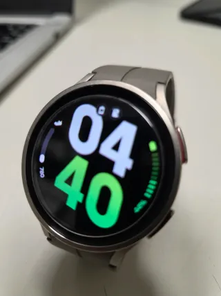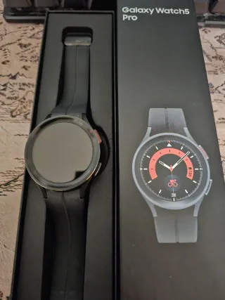Reloj inteligente Samsung Galaxy Watch5 Pro en color negro. Leves marcas de uso poco apreciables, debido a su caja de acero inoxidable. El cristal se encuentra impoluto ya que es de zafiro. Funciona perfectamente. Se vende en su caja, con correa y cargador original. Se vende con muchas correas compatibles, algunas sin estrenar. Se vende por cambio a one plus por regalo de reyes.