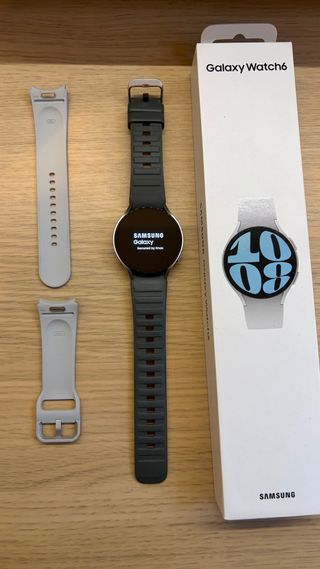 Smart Watch Samsung Galaxy Watch 6 en color plata. Incluye dos correas, la original de Samsung y otra gris. Con caja y cargador magnético original Pantalla en perfecto esto, solo leves marcas en los bordes.