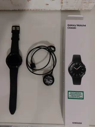 Reloj inteligente Samsung Galaxy Watch 4 Classic Bluetooth. - Tamaño de caja de 46mm. - Incluye correa deportiva original azul/naranja. - Caja original Galaxy Watch Design Studio. - Muy bien cuidado. - Actualizado a One UI 8. - Cargador original. - Regalo de 2 protectores de caja, 2 bisel deportivos y 13 correas (ver fotos). - Protector de pantalla recién puesto.