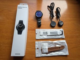 Reloj inteligente Samsung Galaxy Watch5 Pro en acabado negro y gris. Incluye varios accesorios para personalizar tu estilo. - Dos correas adicionales incluidas. - Cargador inalámbrico. - Caja original. - Como nuevo
