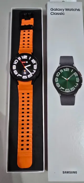 Reloj inteligente Samsung Galaxy Watch 6 Classic en excelente estado,impoluto. Incluye dos correas. - Correa original negra sin estrenar - Correa deportiva naranja. - cargador magnético - pagos NFC - FACTURA con GARANTÍA hasta julio 2027