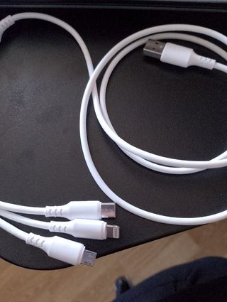 Cable carga con tres entradas: tipo C, micro USB e iPhone. Se puede cargar tres dispositivos mismo tiempo. Color blanco