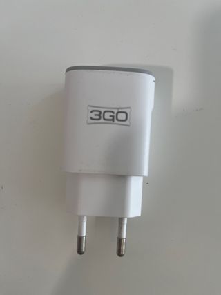 Cargador de pared 3GO, blanco, con un puerto USB. Es compacto y ligero. - Ofrece una potencia de salida de 5V-2A MAX. - Incluye un cable USB y tipo C.