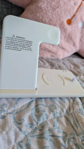 Base de carga inalámbrica para múltiples dispositivos. Permite cargar dos teléfonos, un Apple Watch y airpods con entrada de cable lightning simultáneamente. - Diseño moderno y compacto. - Indicadores LED de carga. - Requiere adaptador QC2.0/3.0 9V/2A o superior para un rendimiento óptimo. Utiliza cable tipo C.