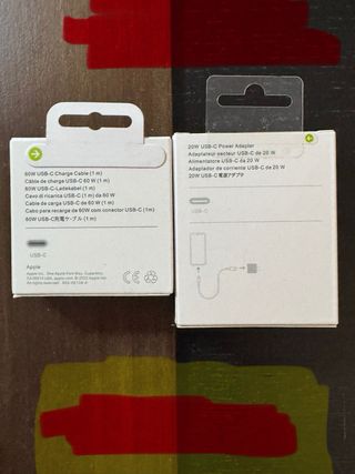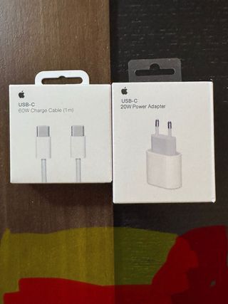 Se vende cargador Apple USB-C de 20W y cable de carga USB-C de 60W (1 metro). - Cargador de pared USB-C 20W. - Cable de carga USB-C a USB-C de 1 metro y 60W.
