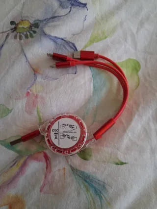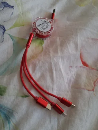 Cable de carga y datos retráctil en color rojo. Ideal para dispositivos con puerto USB-C. - Diseño enrollable para fácil almacenamiento. - Conector USB-C. - Incluye adaptadores para otros tipos de puerto.