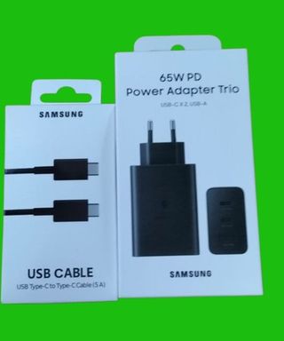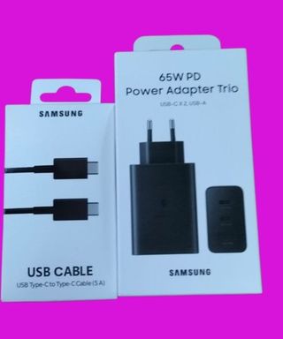 ✅Nuevo Precintado Sellados ❤️1) Cargador Samsung Original Trio 65W EP-6530 con 3 puuertos. CARGADOR ULTRA RÁPIDO ORIGINAL SAMSUNG 65W 3 PUERTOS CON 1 PUERTO TIPO C 65W 1 PUERTO TIPO C 25W 1 PUERTO TIPO USB 15W ❤️2) Cargador Inalambrico Samsung Original con cable 1m Samsung Super Fast Wireless Charger: Ofrece una carga rápida y eficiente. Este modelo utiliza la tecnología "Fast Charge" de Samsung para cargar el dispositivo más rápidamente.