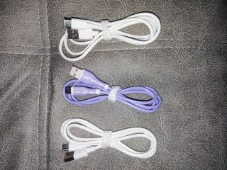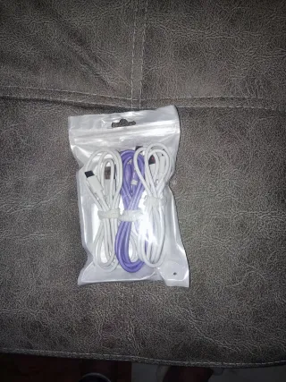Conjunto de cables de carga rápida con conector USB Tipo C. Incluye cables de color blanco y morado. - Conector USB Tipo C. - Cable de carga rápida. 1 metro