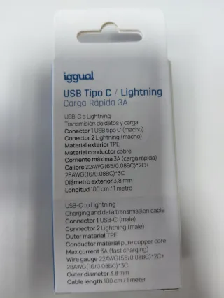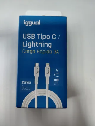 Cable de carga y datos con conectores USB Tipo C y Lightning. Ideal para cargar tus dispositivos rápidamente. - Longitud de 100 cm. - Carga rápida 3A. - Conexión USB Tipo C a Lightning. Está nuevo y la caja sin abrir. Comprado por error.