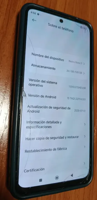Vendo Redmi Note 11 usado durante varios años, restablecido de fábrica y listo para usar. Siempre ha llevado carcasa y protector de pantalla, por lo que la pantalla está en perfectas condiciones, sin rayones ni golpes. 🔹 Se entrega sin cargador. 🔹 Incluye carcasa y protector de pantalla (ambos con signos de uso). 🔹 Batería en buen estado, rendimiento fluido. 🔹 Android 13 actualizado (versión TKQ1.221114.001). 🔹 128 GB de almacenamiento. 🔹 Cámara, botones y conectores funcionando correctamente. ✔ Pantalla perfecta ✔ Funciona todo ✔ Restablecido de fábrica ✘ Sin cargador ✘ Carcasa y protector con desgaste