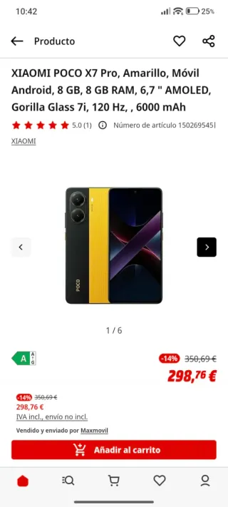 Teléfono móvil Xiaomi POCO X7 Pro en color amarillo y negro. Cuenta con una gran pantalla AMOLED y una batería de larga duración.Fecha de compra mes de septiembre 2025.Dispone de caja ,factura no de cargador. - Pantalla: 6,7 AMOLED, 120 Hz. - Batería: 6000 mAh. - Almacenamiento: 8 GB RAM. - Protección: Gorilla Glass 7i. - Sistema Operativo: Android.