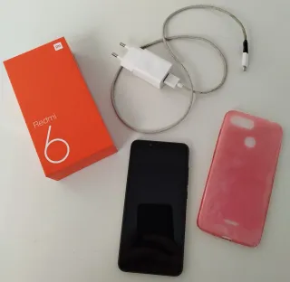 Teléfono móvil Xiaomi Redmi 6 en color negro, con funda protectora rosa. - Incluye cargador y cable. - Caja original. 3 GB ROM 32 GB RAM
