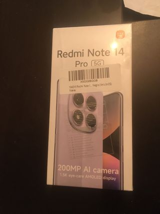 Teléfono móvil Xiaomi Redmi Note 14 Pro 5G en color negro. Cuenta con una cámara principal de 200MP y una pantalla 1.5k AMOLED. El móvil te viene con funda Xiaomi color Gris negro.y cargador original Sólo lo abrí para verlo Con factura 250€ costó Regaló tres protectores para cámaras traseras - Cámara principal de 200MP. - Pantalla AMOLED 1.5K. - Conectividad 5G.