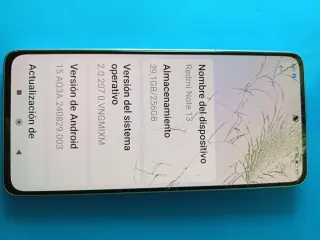 Teléfono móvil Redmi Note 13 con gran capacidad de almacenamiento. - Nombre del dispositivo: Redmi Note 13 - Almacenamiento: 39,1GB/256GB - Versión del sistema operativo: 2.0.207.0.VNGMIXM - Versión de Android: 15 AQ3A.240829.003 Nota tiene el visor quebrado El táctil funciona bien lo VENDO Por k tengo uno nuevo Lo entrego con caja sin cargador