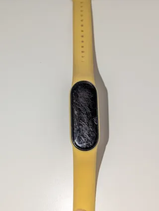 Pulsera de actividad Xiaomi Mi Band 5 con correa de silicona en color amarillo. Tiene la pantalla rota y rayada. No sé si funciona o no ya que no tengo el cargador.