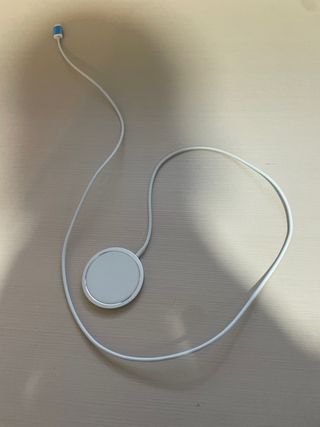 Cargador inalámbrico MagSafe de Apple. - Diseño circular blanco. - Cable integrado.