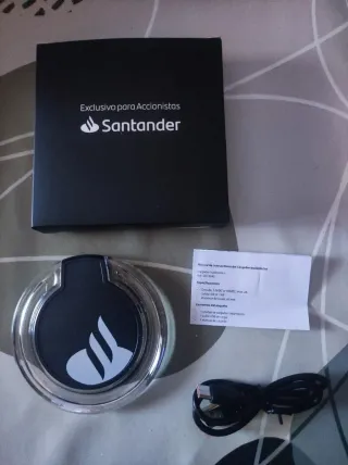 Cargador inalámbrico exclusivo para accionistas de Santander. Incluye cable USB y manual. - Entrada: 5.0VDC or 9.0VDC, max. 2A - Salida: 5W or 15W - Distancia de carga: ≤6 mm - 1 unidad de cargador inalámbrico - 1 cable USB de carga - 1 manual de usuario