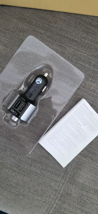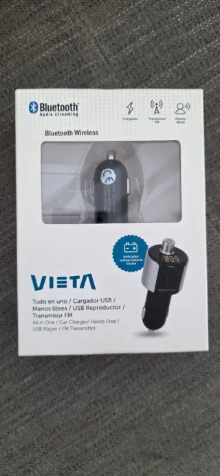 Cargador para el coche con conexión al mechero. - Tiene dos puertos para cargar y/o reproductor. - Carga rápida. - Diseño plateado y negro. - Marca VIETA. - Nuevo, sin estrenar.