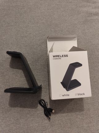 Base de carga inalámbrica negra para móvil, reloj y auriculares. Incluye cable USB. Está en perfecto estado. - Carga inalámbrica para tres dispositivos simultáneamente. - Diseño elegante y compacto. - Fácil de usar.