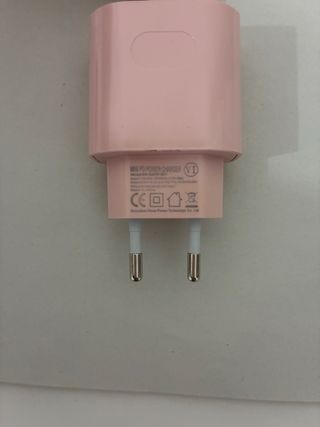 Cargador de móvil en color rosa, compuesto por un adaptador de corriente y un cable. - Adaptador de corriente con clavijas europeas. - Cable con conector Lightning.