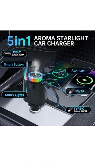 Este cargador para coche combina varias funciones en un solo dispositivo. - Puerto USB-C con salida 5V/3A. - Puerto USB-A con salida 5V/3A. - Puerto USB-C con salida 30W PD. - Función de atomizador para aromaterapia. - Luces LED tipo Starry Lights con varios colores. - Botón inteligente para control.