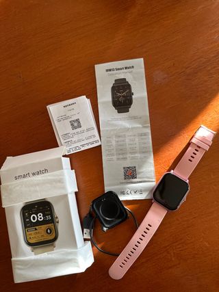 Smartwatch IDW13 con correa rosa y detalles dorados. Incluye cargador. - Pantalla táctil. - Correa ajustable. - Incluye manual de operación.