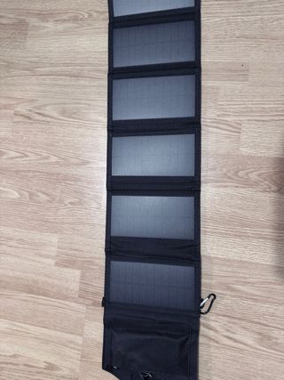 Panel solar portátil plegable de 20W con salida USB de 5V. Ideal para cargar dispositivos en exteriores. - Diseño compacto y ligero. - Múltiples paneles solares. - Incluye mosquetón para colgar.