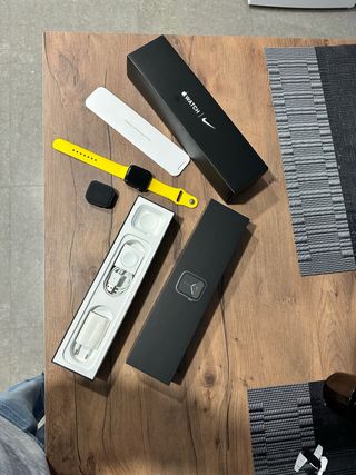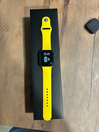 Apple Watch Serie 5. - Caja negra de 44mm. - Correa amarilla (no es la original de Nike) - Cargador magnético original. - Caja y accesorios originales. Presenta signos normales por el uso, pero funciona perfectamente. La duración de la batería es de un mínimo de 12 h. En uso normal más. Entrega en mano en Ávila. Envíos.