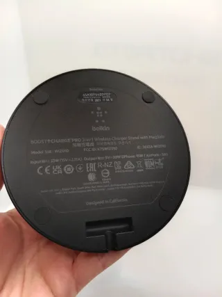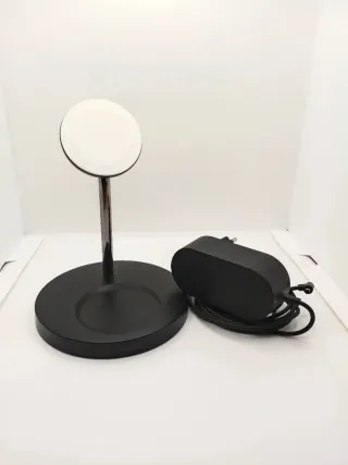 Cargador inalámbrico Belkin en color negro. Incluye base y adaptador de corriente. - Diseño moderno y elegante. - Base circular con soporte. - Adaptador de corriente compacto. - Precio negociable.