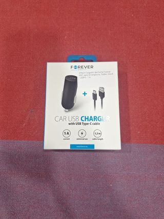 Cargador de coche USB de la marca Forever, prácticamente nuevo. Incluye cable USB tipo C de 1,2m. - 1A de corriente. - Uso universal. - Cable de 1,2m de longitud.