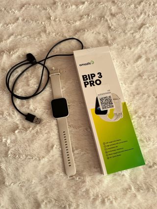 Reloj inteligente Amazfit BIP 3 PRO en color beige. Incluye cargador. Tiene un pequeño arañazo como se ve en la foto, pero está nuevo. - Pantalla a color de 1.69 - GPS y GLONASS de alta precisión - Batería de larga duración - Resistencia al agua 5 ATM - Medición de saturación de oxígeno en sangre - Más de 60 modos deportivo