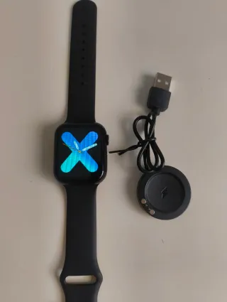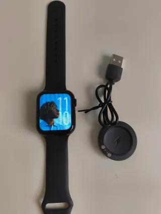 Reloj inteligente con correa negra y pantalla a color. - Correa de silicona. - Cargador magnético incluido.