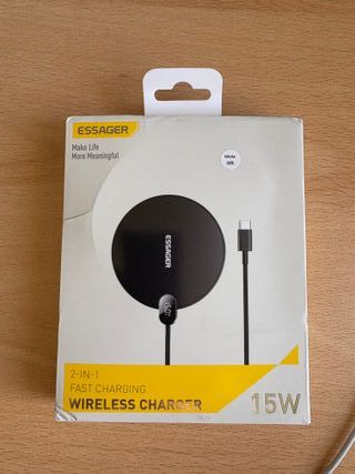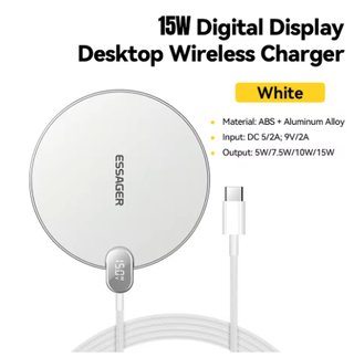 Cargador inalámbrico Essager de 15W con pantalla digital. - Carga rápida. - Diseño circular. - Cable USB-C incluido. - Color Blanco. - Totalmente nuevo. Sin usar