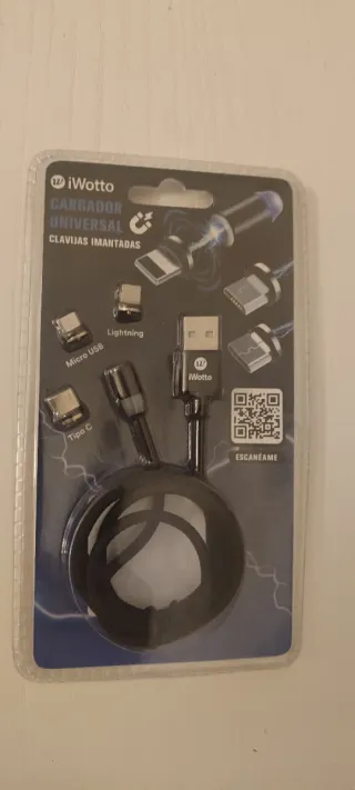 Este cargador universal de iWotto cuenta con clavijas imantadas para una conexión sencilla y segura. - Incluye clavijas Micro USB, Lightning y Tipo C. - Diseño magnético para mayor comodidad.
