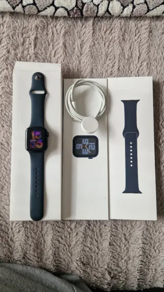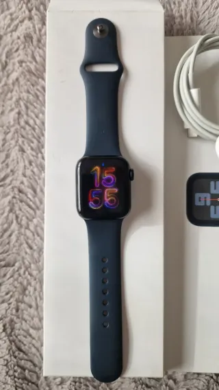Reloj inteligente Apple Watch SE de segunda generación en color azul marino. - Tamaño de 40 mm. - Incluye cargador magnético. - Correa de silicona azul marino. - Tiene un único roce en la parte inferior izquierda como se ve en la foto.