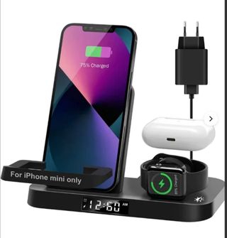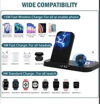 Cargador inalámbrico 3 en 1 Neekfox. 15W. Cargador multifunción que te ayuda a cargar 3 dispositivos a la vez: móvil, SmartWatch y auriculares tanto Apple como Android siempre que dispongan de carga inalámbrica. Con temporizador de sueño y dimmer de tres niveles y función de despertador. Incluye accesorio para cargar iPhone mini, adaptador de 18W QC 3.0, cable tipo C y manual. Ajustable en ángulo y plegable. Tipo de conector USB. NUEVO a estrenar en caja.