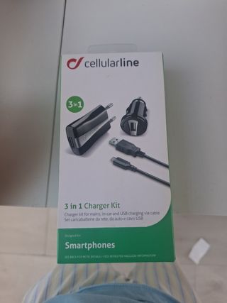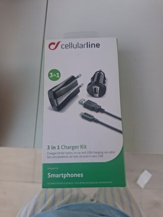 Kit de carga Cellularline 3 en 1 para smartphones. - Cargador para red eléctrica. - Cargador para coche. - Cable de carga USB.