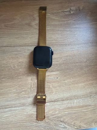 Reloj inteligente Apple Watch Series 7 con acabado en negro y detalles dorados. - Caja de aluminio en color negro. - Correa tipo milanesa en color dorado. - Cierre magnético ajustable. -capacidad del 100% -tengo caja correas y cargador original