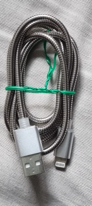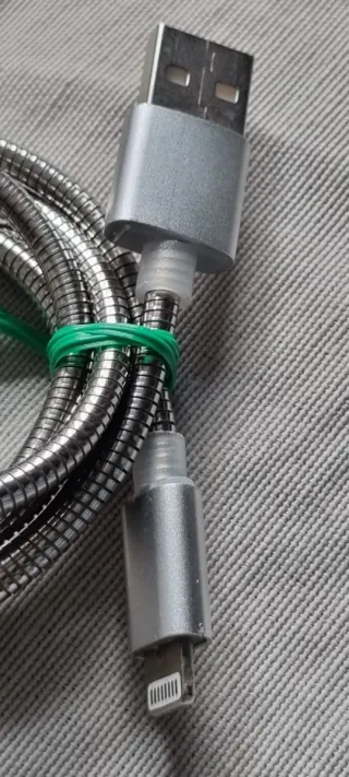 Cable de carga con conectores USB y Lightning. Su diseño es metálico y resistente. - Cable con recubrimiento metálico. - Conector USB. - Conector Lightning.